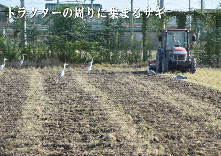 畝立ての隣りの田んぼにトラクターを入れていたことろ、多くのサギが集まってきていました。 |