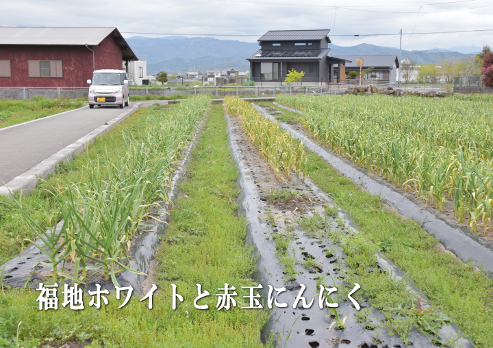圃場西側の赤玉にんにくと福地ホワイトの畝の様子。